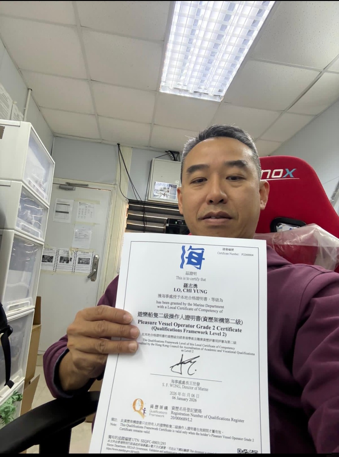 「在此非常感謝黃SIR嘅悉心教導, 令我可以喺兩個月內考取三個牌, 原計劃係想考三級營業船長, 跟住去水佬學堂報讀二級遊艇補底, 首先考二級遊艇合格咗之後, 再報考埋三級營業船長, 再合格後, 即刻報考埋三級輪機, 幸運地兩個月內一TAKE過PASS。好記得我啱啱上學堂溫書嘅時候, 每日都好努力去睇天書同埋試題, 但睇完都唔明成日走去問黃SIR, 佢不厭其煩地解答我所有嘅難題, 教識好多考試口訣令我易於明白, 加上學堂嘅模擬試題非常精準, 令我考試當日更加事半功倍, 深信只要努力溫書就有好成績。在此無言感激:黃SIR係一個有教無類, 值得學生尊敬嘅好老師。2026祝願你身體健康, 工作順利。」