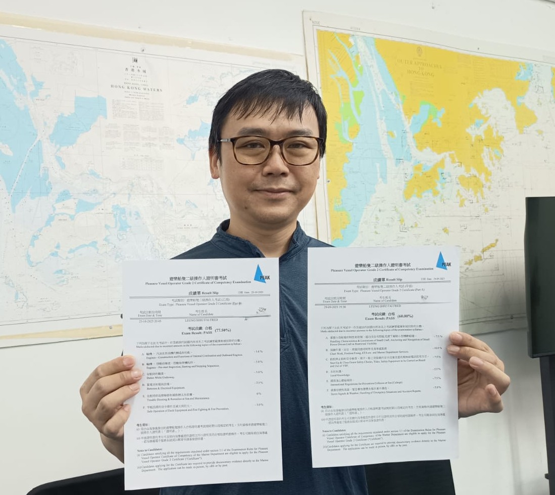 今次考試能夠順利合格,要好多謝能有經驗非常豐富嘅導師講解,好有心機教得好好,還有提供大量習作題目供學生練習,最好的服務就是考試前還可隨時回校重溫同做練習。boatpeople 的資訊亦都緊貼最新情況,我對boatpeople 嘅二級遊艇課程感到非常卓越同十分滿意。